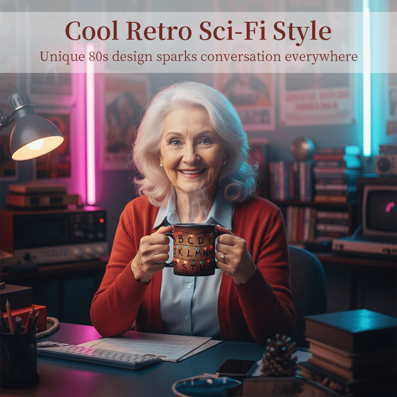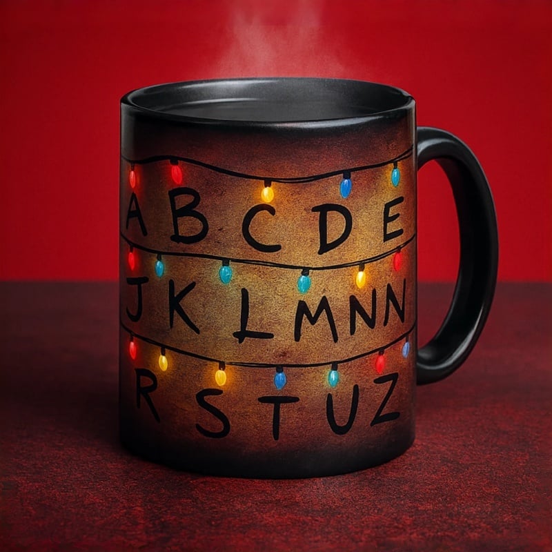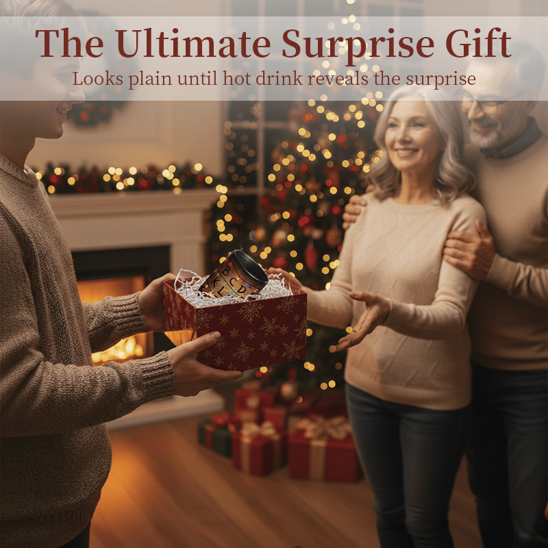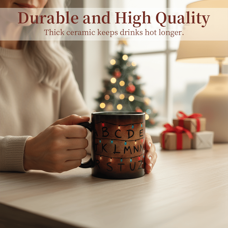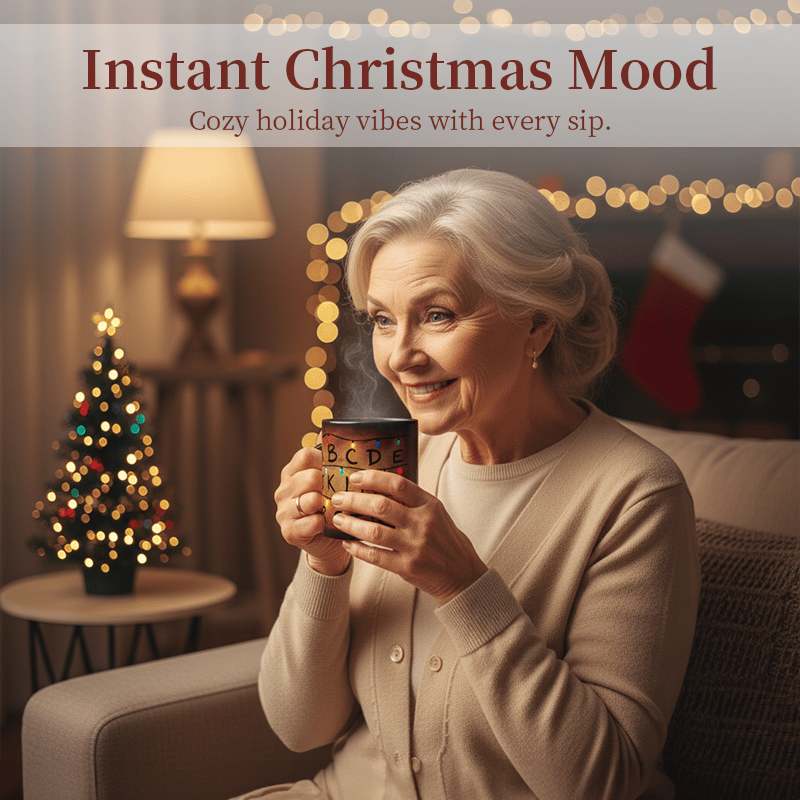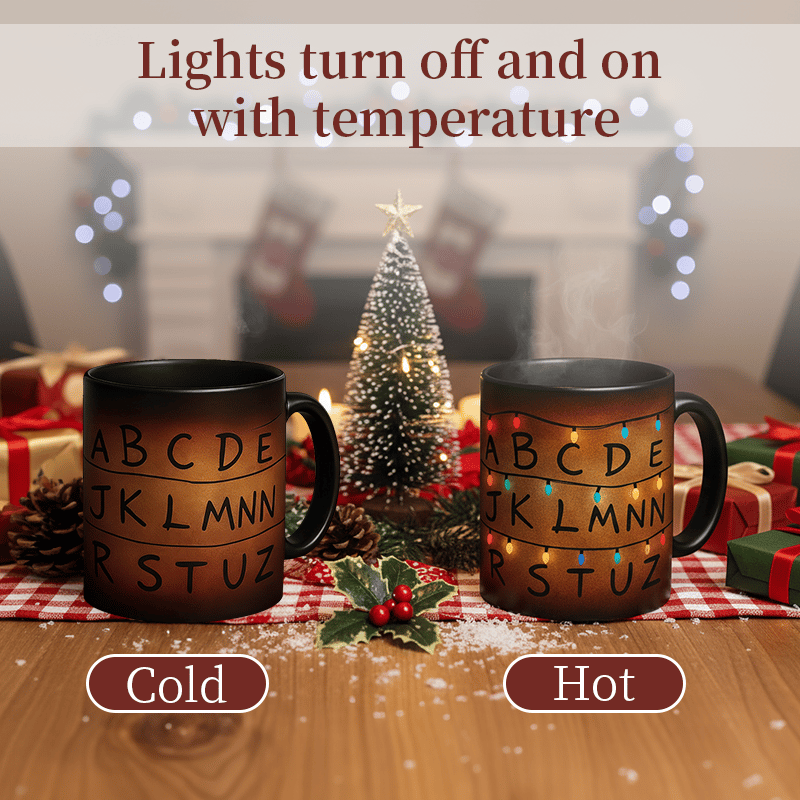 Simply pour in your hot coffee or tea and watch the dark surface instantly light up with colorful holiday bulbs. It creates a stunning visual experience that brings the mysterious alphabet design to life.